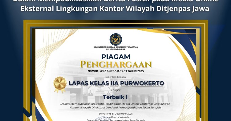 Purwokerto - Lembaga Pemasyarakatan Kelas IIA Purwokerto berhasil meraih Penghargaan Terbaik I dalam Publikasi Berita Positif pada Media Online Eksternal di lingkungan Kantor Wilayah Direktorat Jenderal Pemasyarakatan Jawa Tengah.